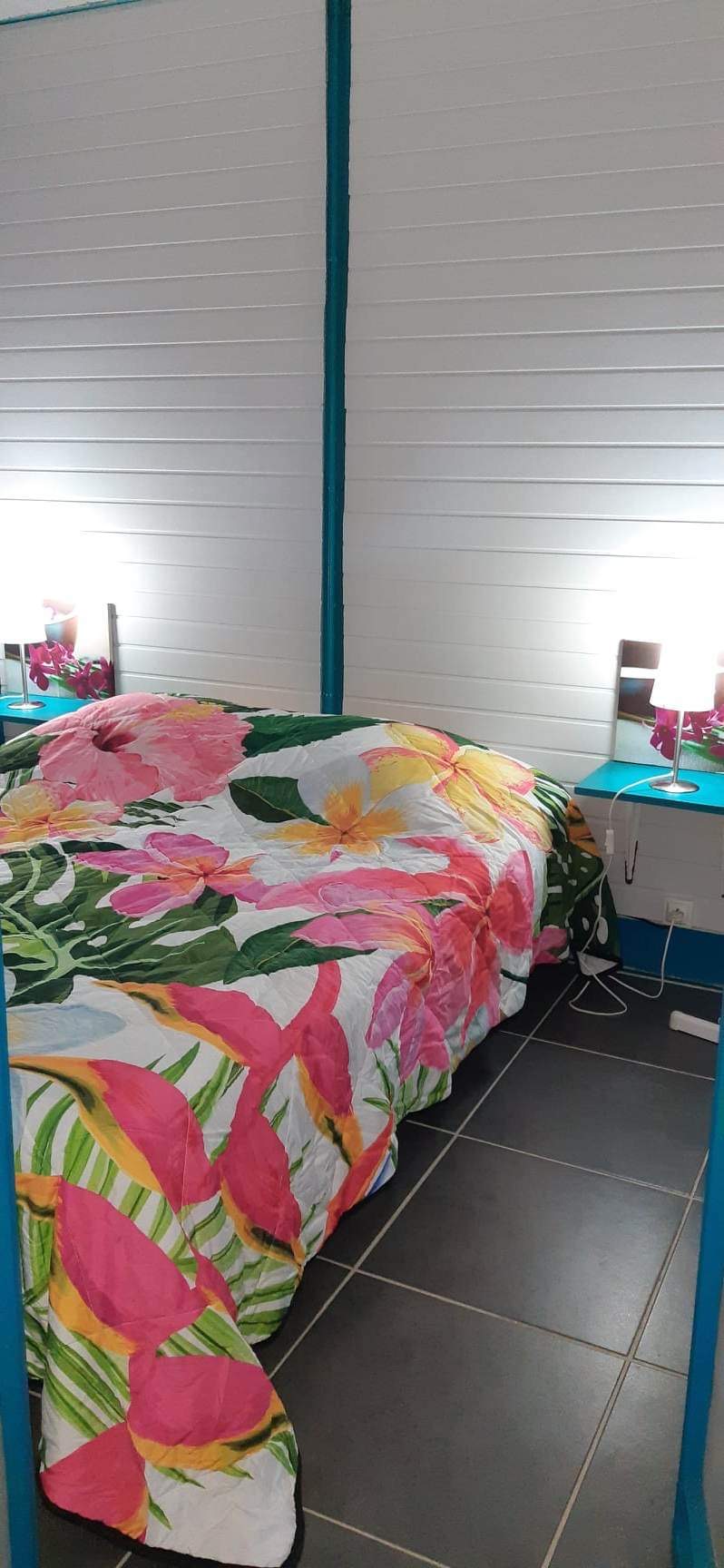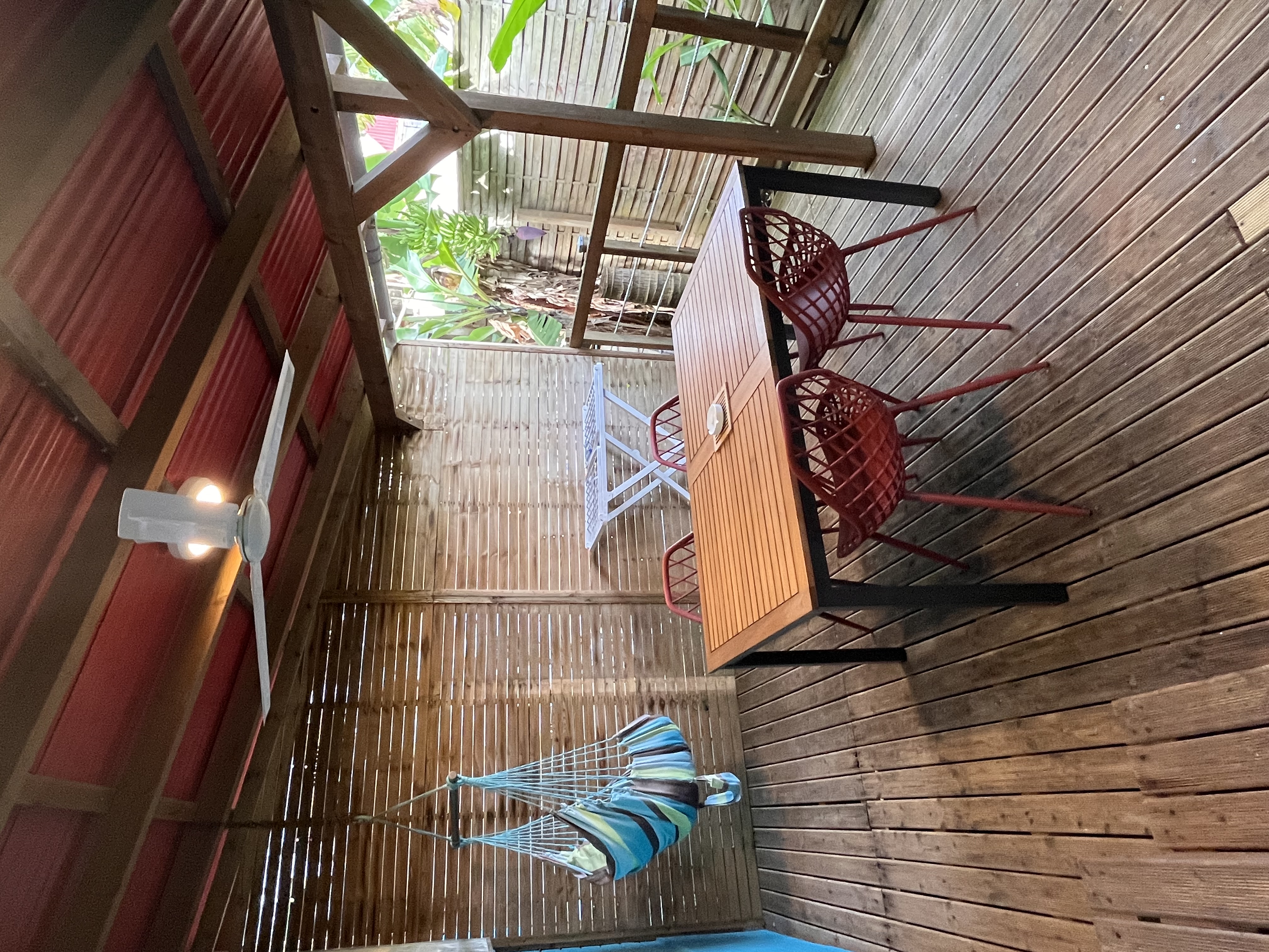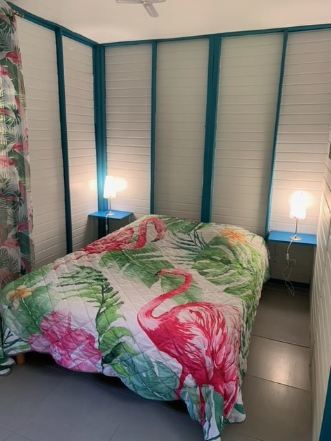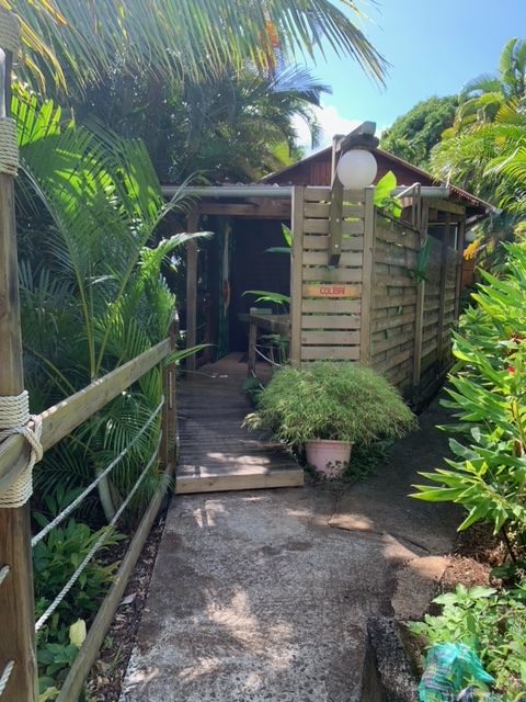 Bungalow type T2 sur pilotis niché au milieu d'un jardin tropical . Equipé d'une cuisine, de 2 chambres, d'une salle de douche et d'une terrasse. Bungalow rénové en août 2025.
