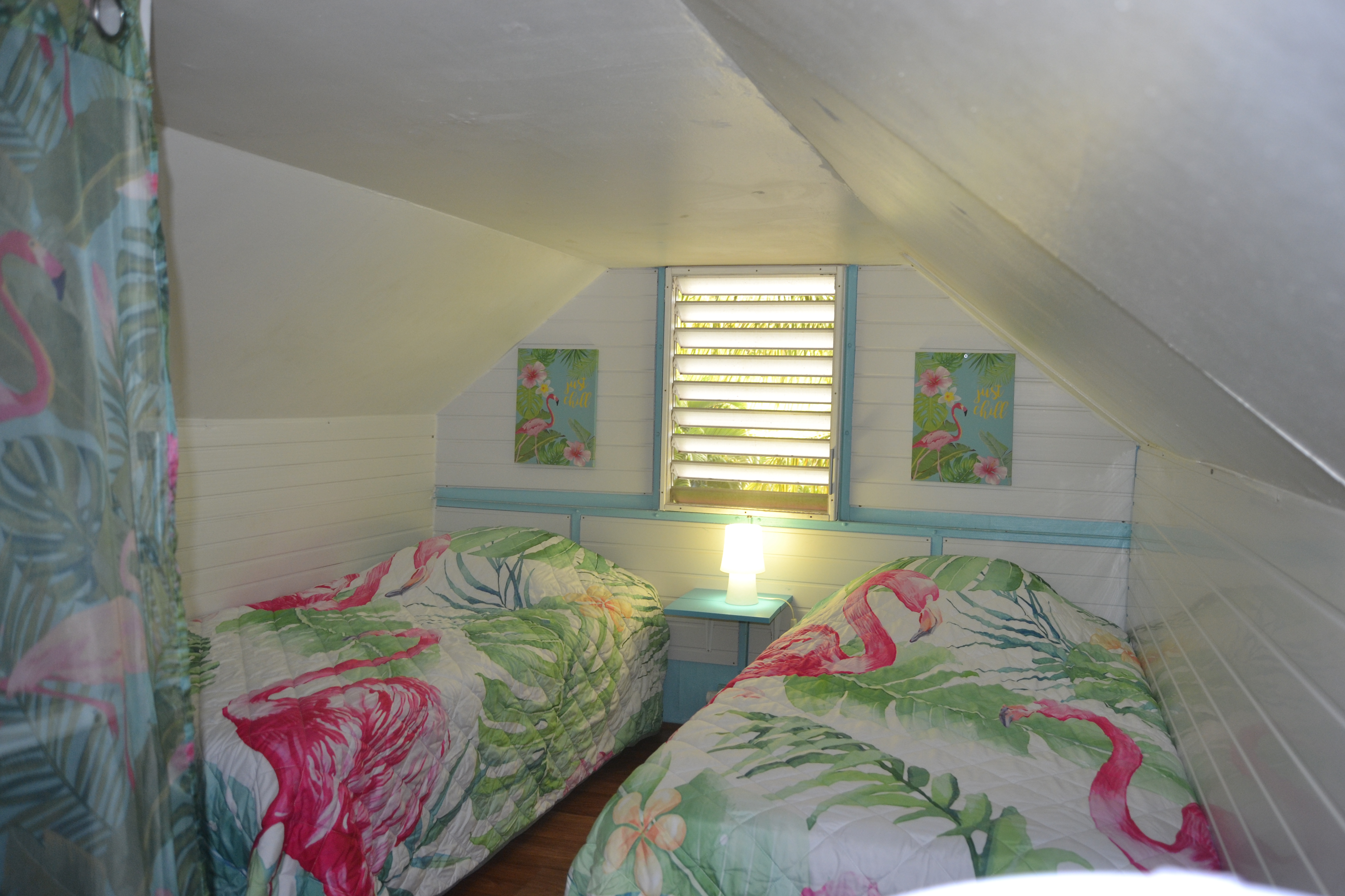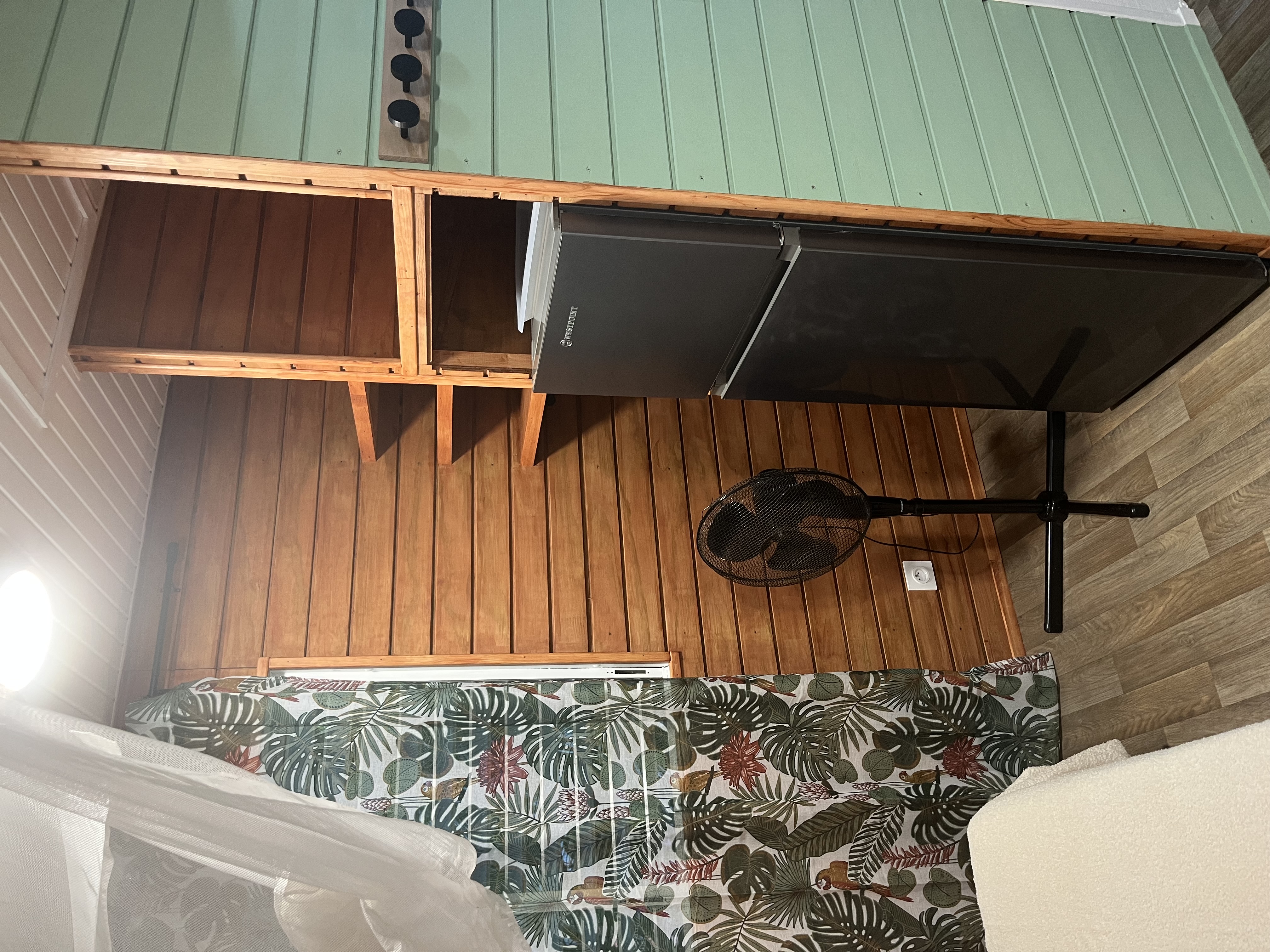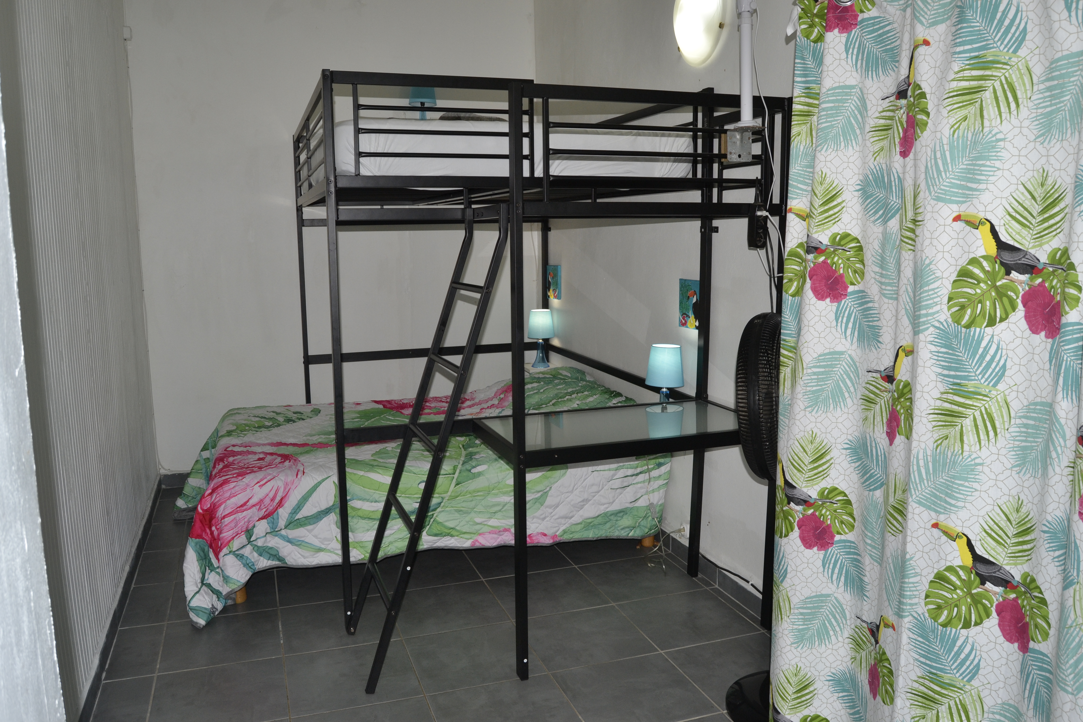 Bungalow type T2 sur pilotis niché au milieu d'un jardin tropical . Equipé d'une cuisine, de 2 chambres, d'une salle de douche et d'une terrasse. Bungalow rénové en août 2025.
