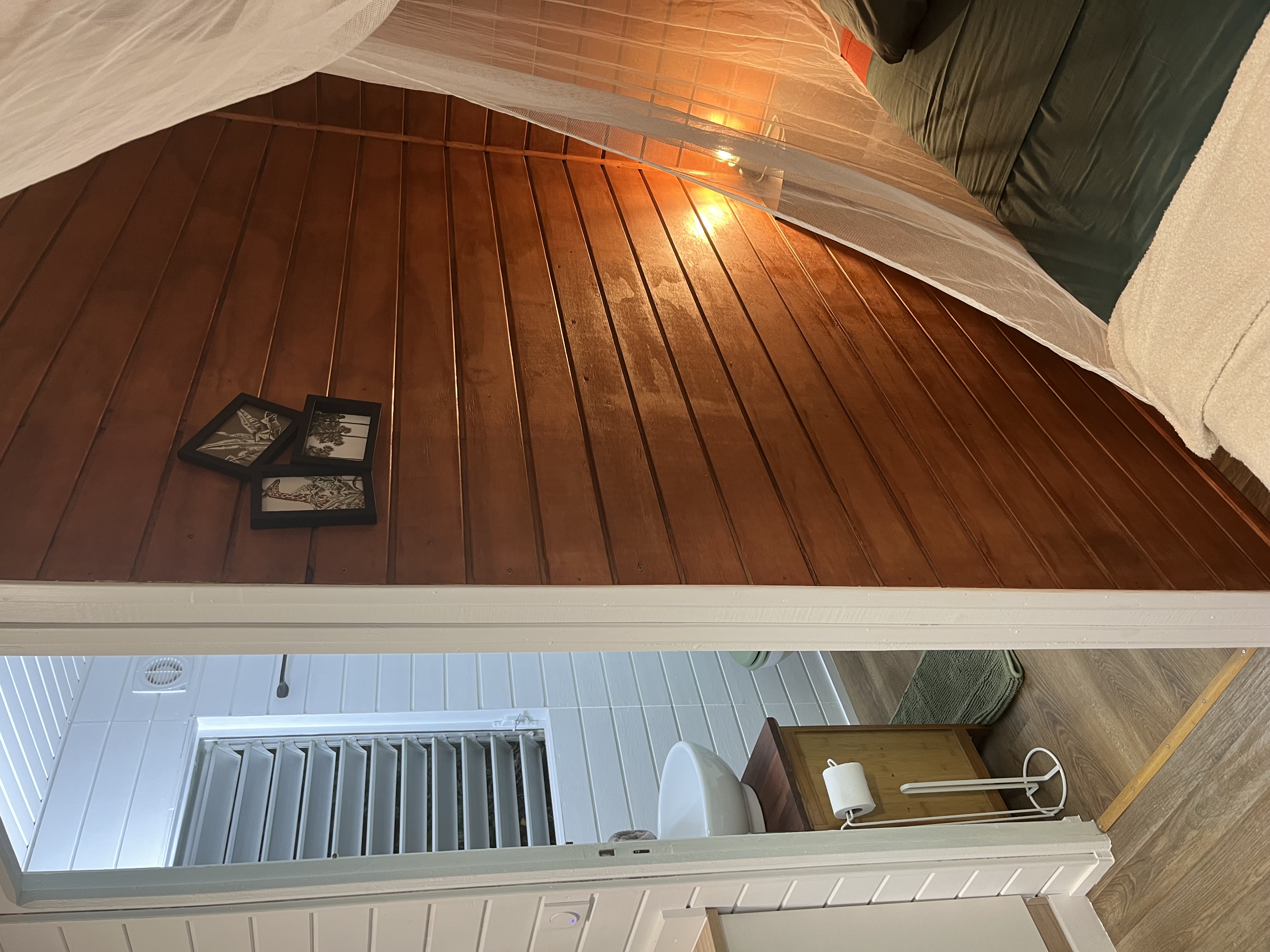 Bungalow type T1 sur pilotis niché au milieu d'un jardin tropical avec vue mer. Equipé d'une cuisine, d'une chambre, d'un salon, d'une salle de douche et d'une terrasse.